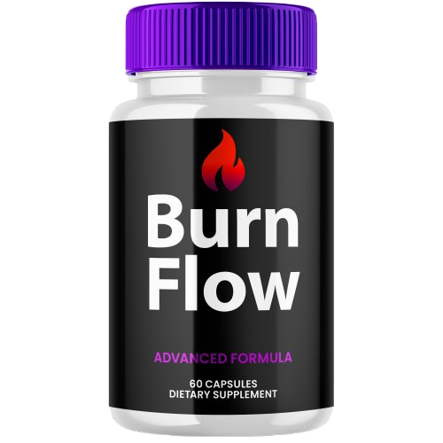Burn Flow is presented as a weight loss supplement aimed at boosting metabolism and fat burning, featuring a blend of ingredients like Cinnamon and Green Tea Extract. The label lists 600 µg of Folate, 240 µg of Vitamin B12, and 833 mg of a mysterious blend.